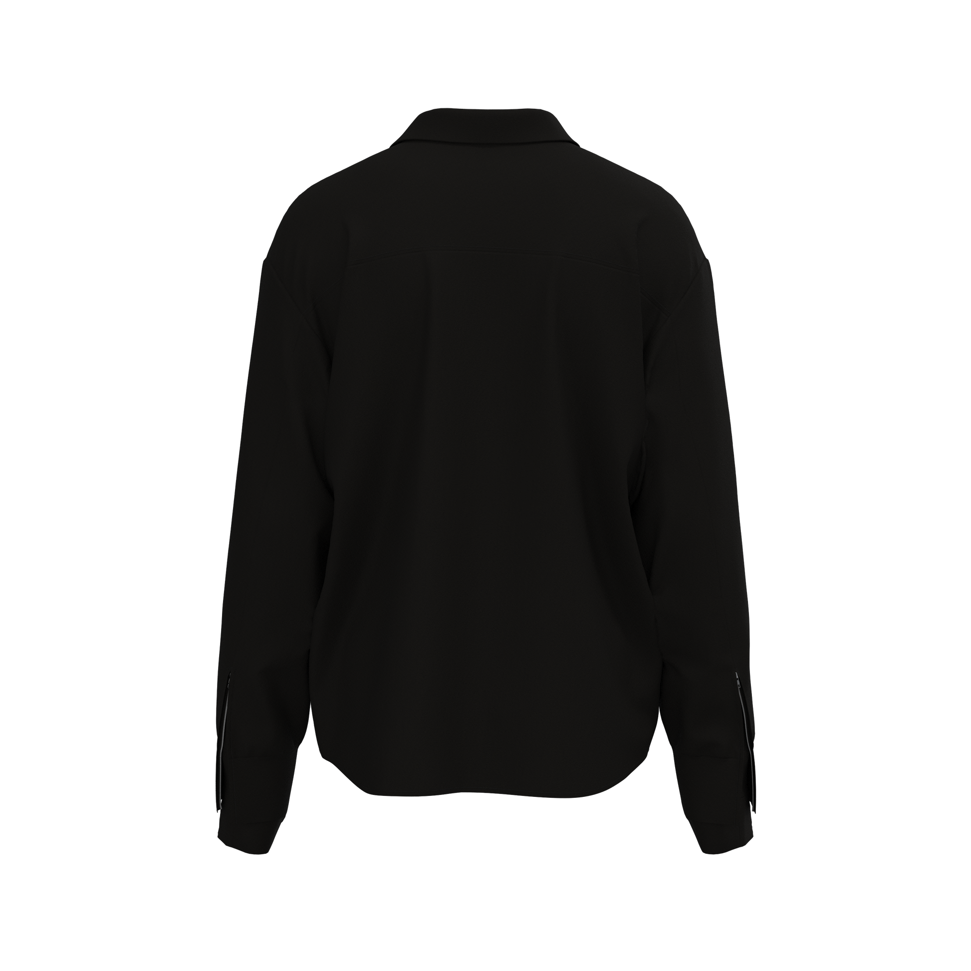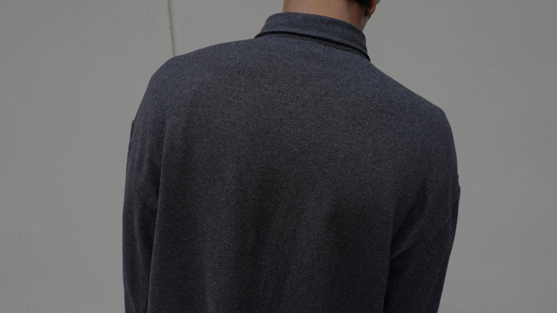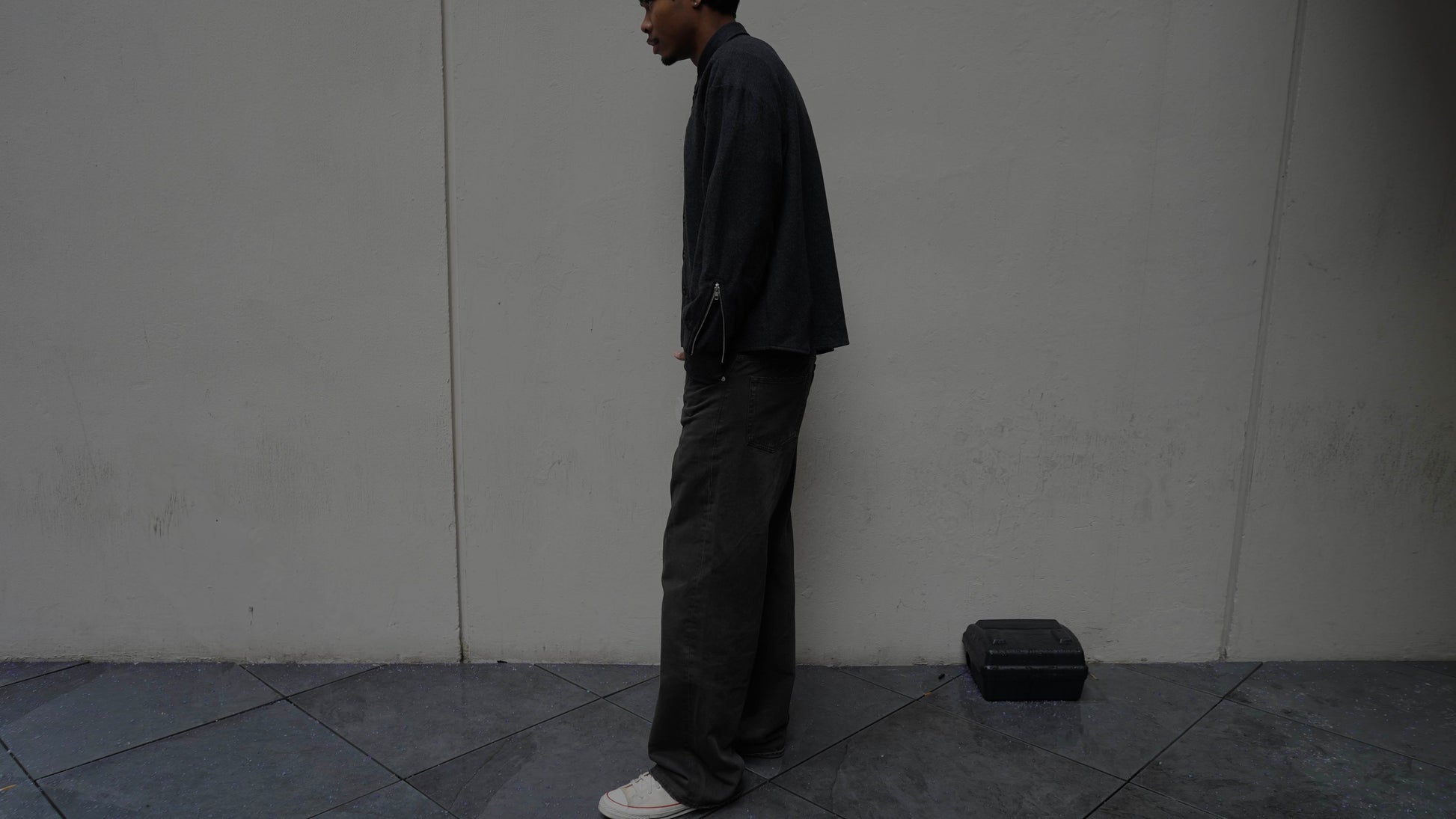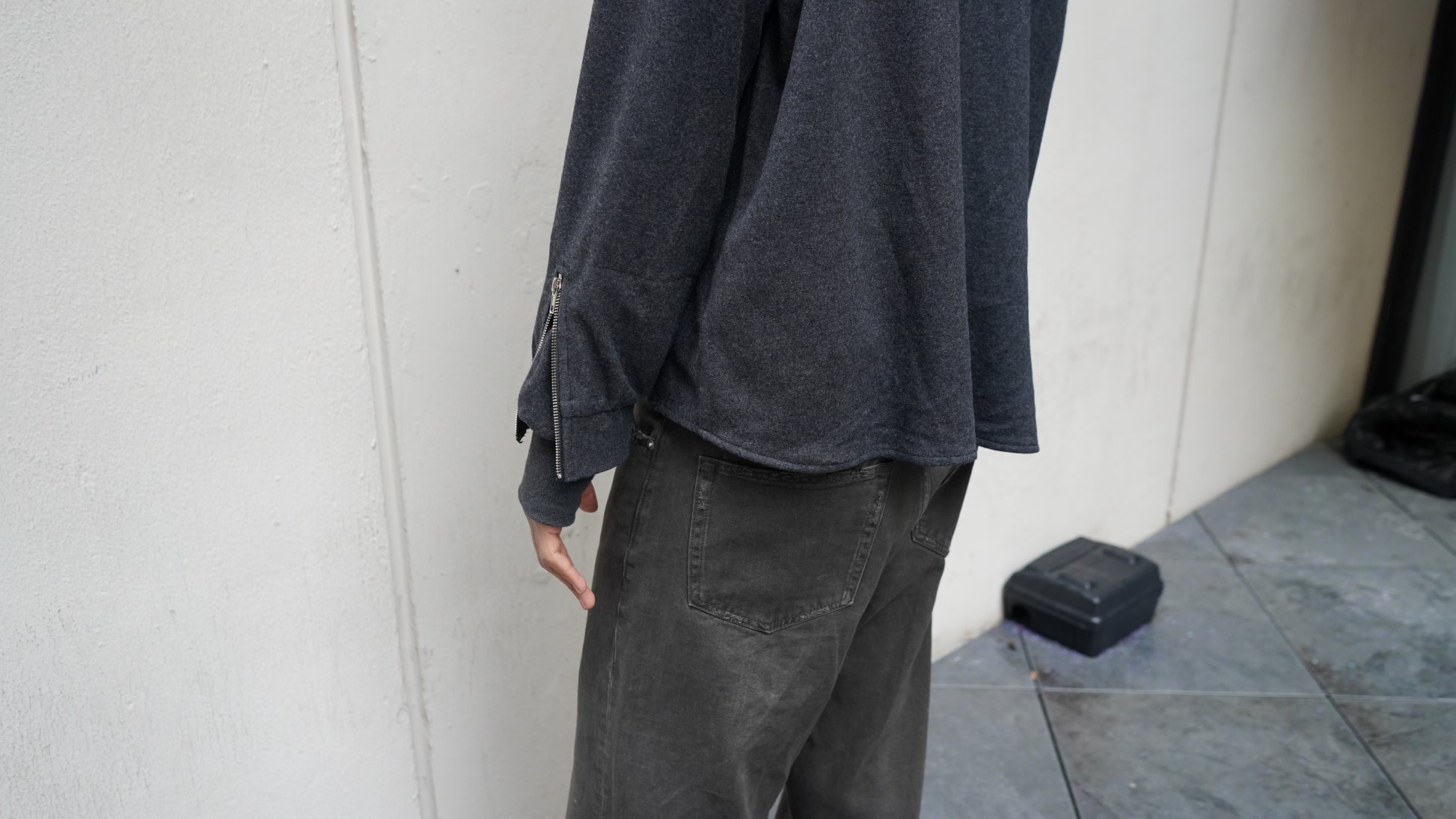 Crafted from 100% wool, balancing structure with natural warmth and fluid drape. Semi-translucent brown-black buttons, arm zippers, and rib-knit cuffs with thumb holes introduce quiet utility. Designed to feel lived-in yet deliberate, holding presence without excess.